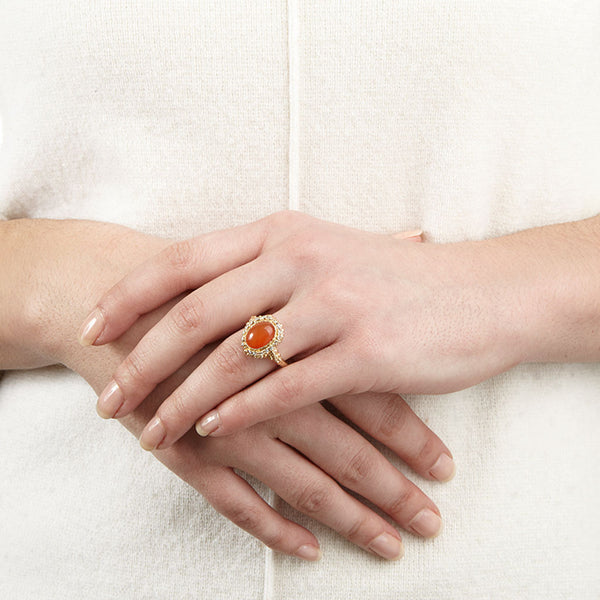 The beautiful La Belle ring features a vibrant orange carnelian stone at its centre, surrounded by a halo of seed pearls. All encrusted in rose gold plated silver atop a hammered band.