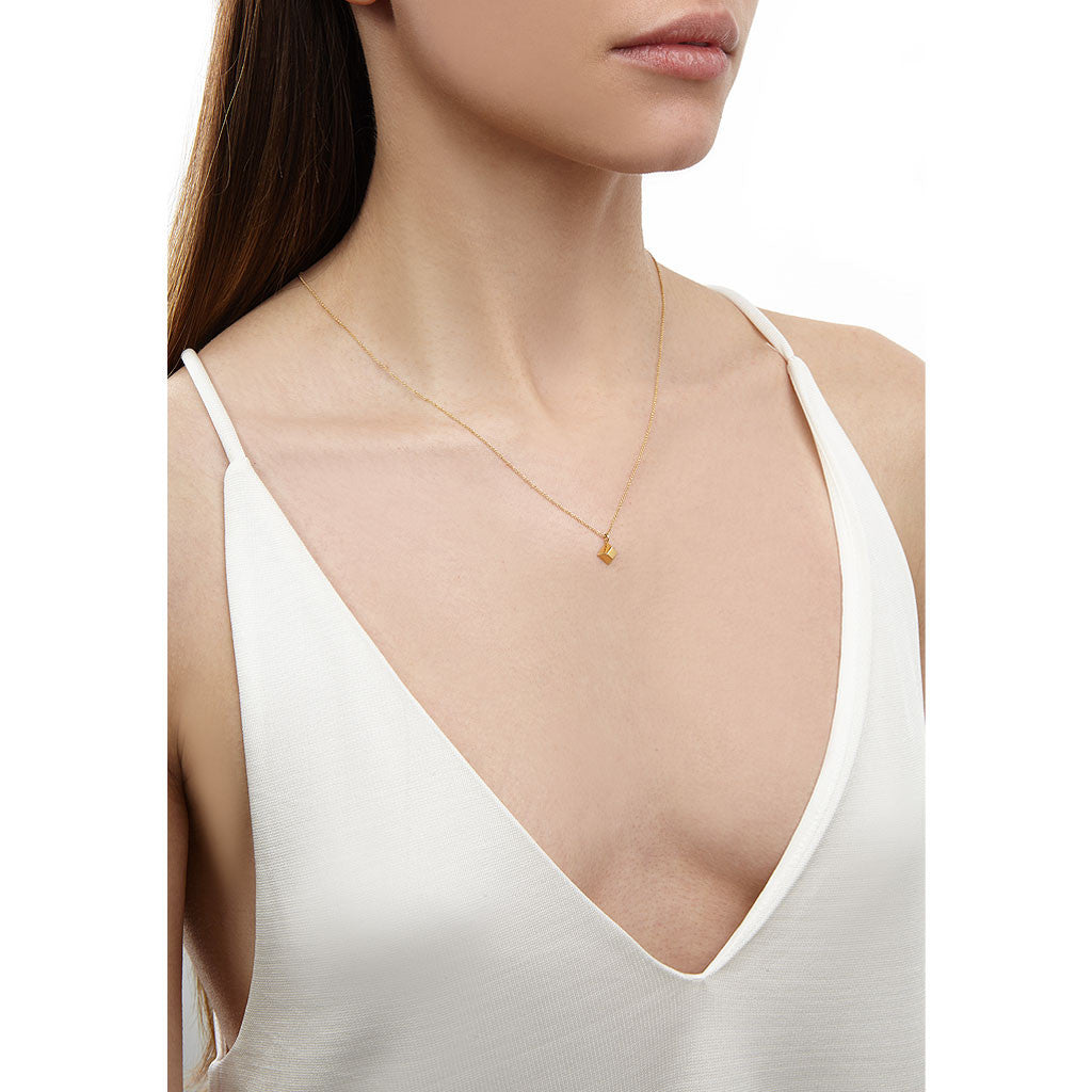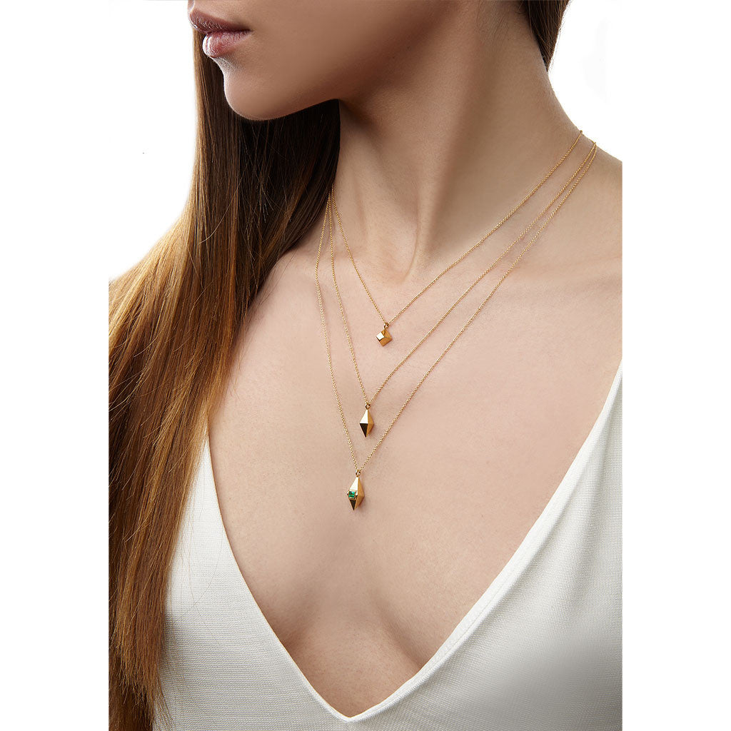 This beautiful gold pyramid necklace brings a clean and minimal aesthetic to your everyday look. The pendant is suspended on a fine trace chain featuring a shackle catch fastening.