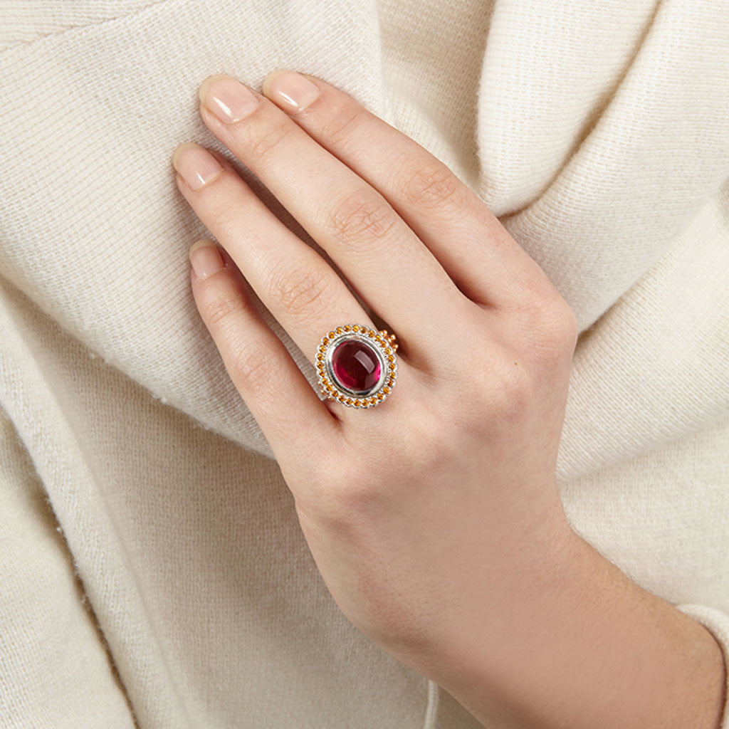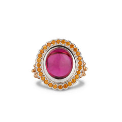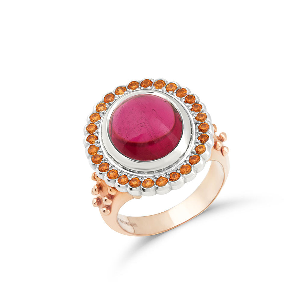 This beautiful one of a kind cocktail ring evokes the colours and textures of exotic sea creatures found in coral reefs. At its centre sits a shocking-pink rubellite cabochon surrounded by glittering orange spessartine garnets, pavé set in white gold. The band is fashioned in a soft rose gold encrusted with little granules.