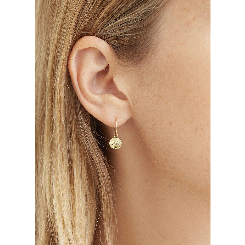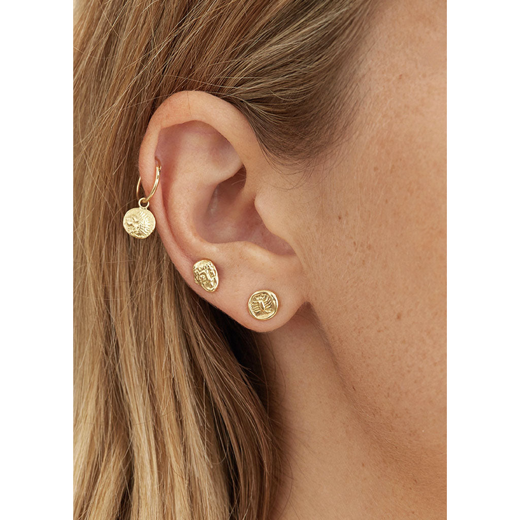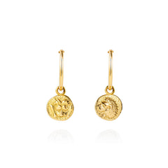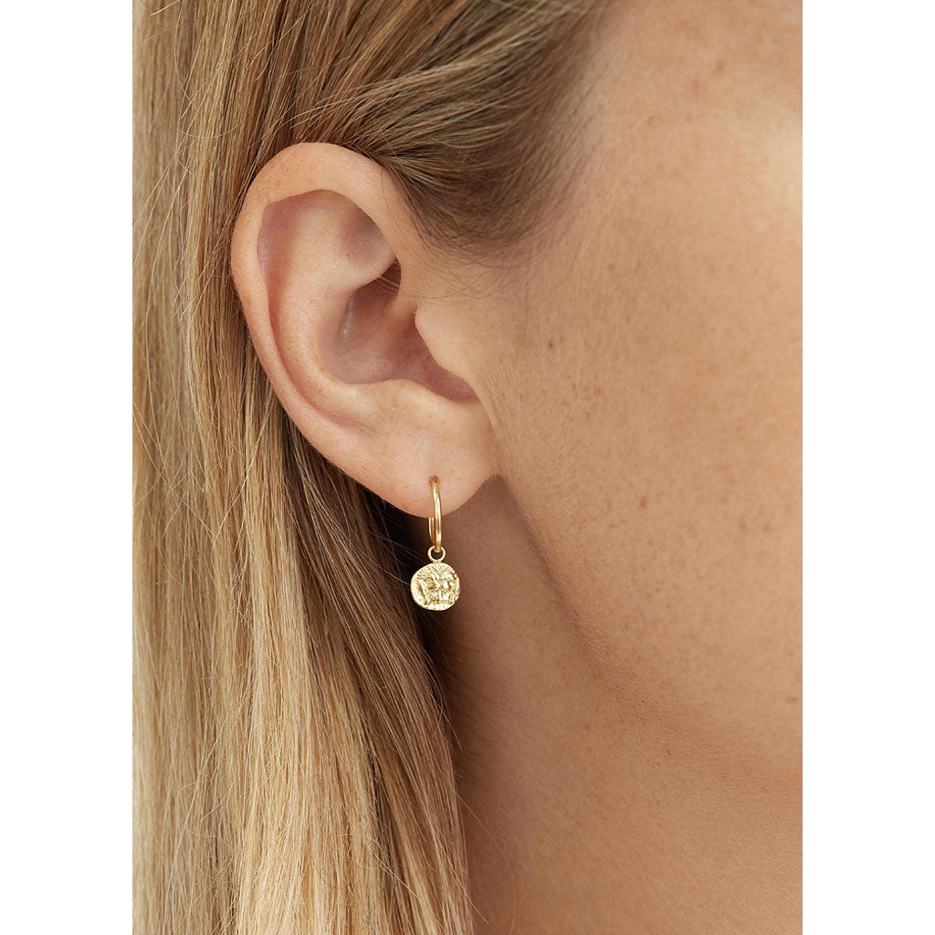 These dainty mini hoop earrings feature intricately carved little lion heads on discs of gold, both front and back. They can be worn as an asymmetric pairing or with matching lion faces. A versatile style, these hoops have an integral hinge opening which allows you to easily remove the discs and wear them as pendants on a necklace. Worn alone or as part of a cool layered look if you have multiple piercings, they're perfect for everyday.