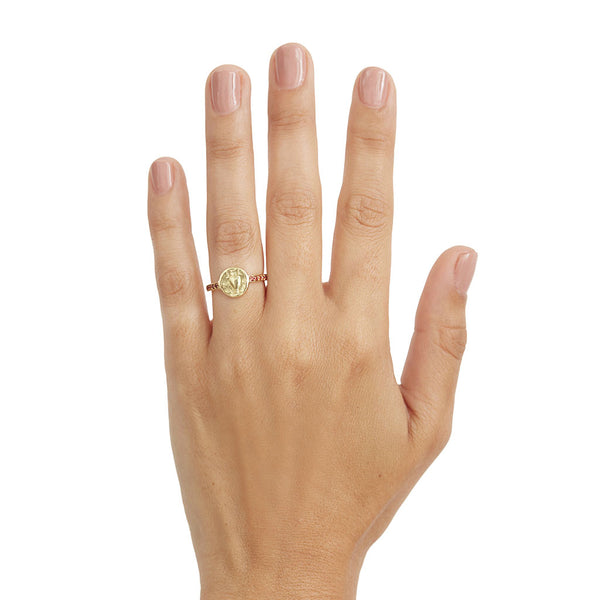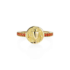 The Amphora ring in 18K yellow gold features a beautifully carved ancient greek vase at its centre, nestled within a fine hammered band. Pavé set with twelve fiery orange sapphires along its shoulders.